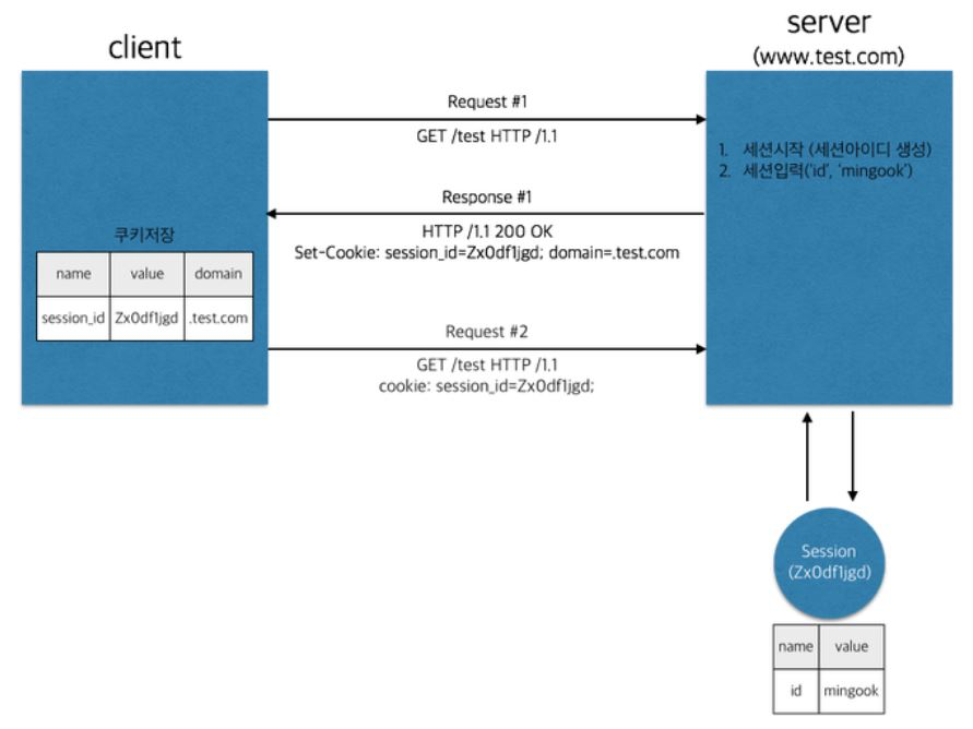 - 서버는 요청에 대한 적절한 처리를 수행하고, 세션을 생성한 후 세션 ID를 HTTP 헤더 쿠키 정보에 담아 응답한다.