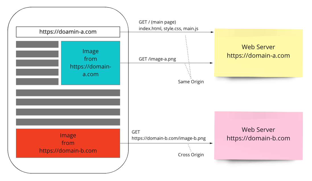 https://domain-a.com/가 입력되면 브라우저는 웹 서버에서 HTML 문서, 스타일 파일, 스크립트 파일 등을 다운로드 받고 화면에 표시한다. 현재 브라우저가 보여주는 화면의 출처는https://domain-a.com/이다. - 브라우저가 화면에 보이는 첫 번째 이미지는