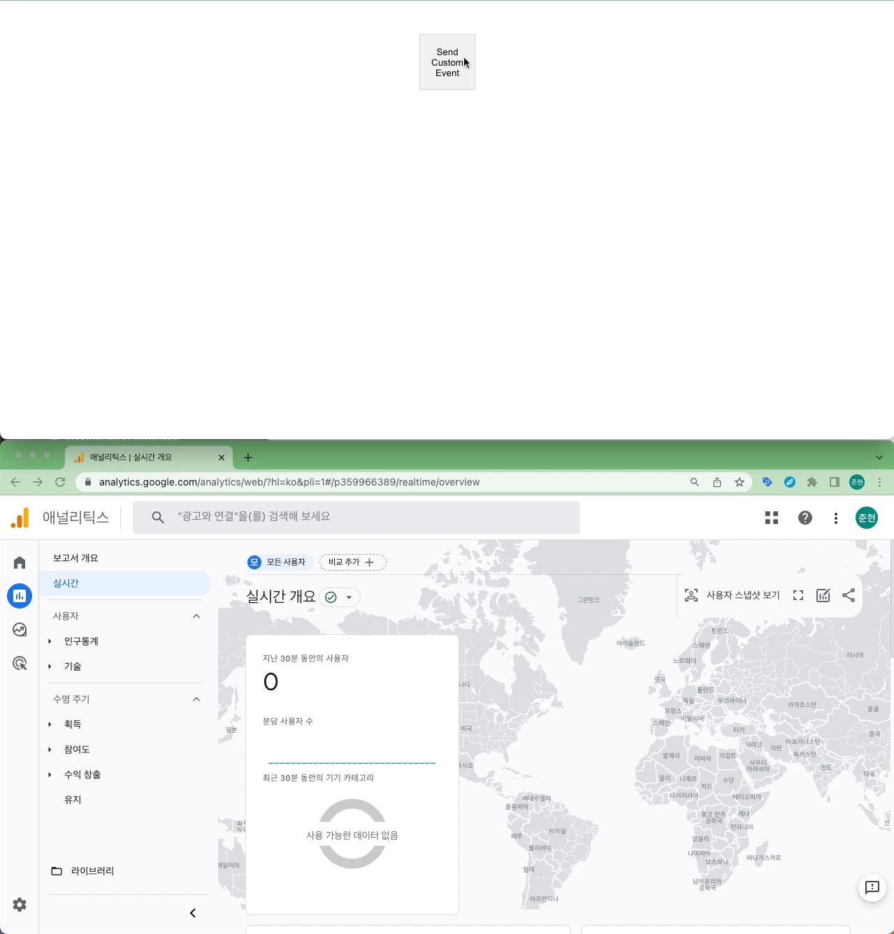 custom_data로 정의합니다.- 지정한 이름으로 구글 애널리틱스에서 확인 가능합니다.