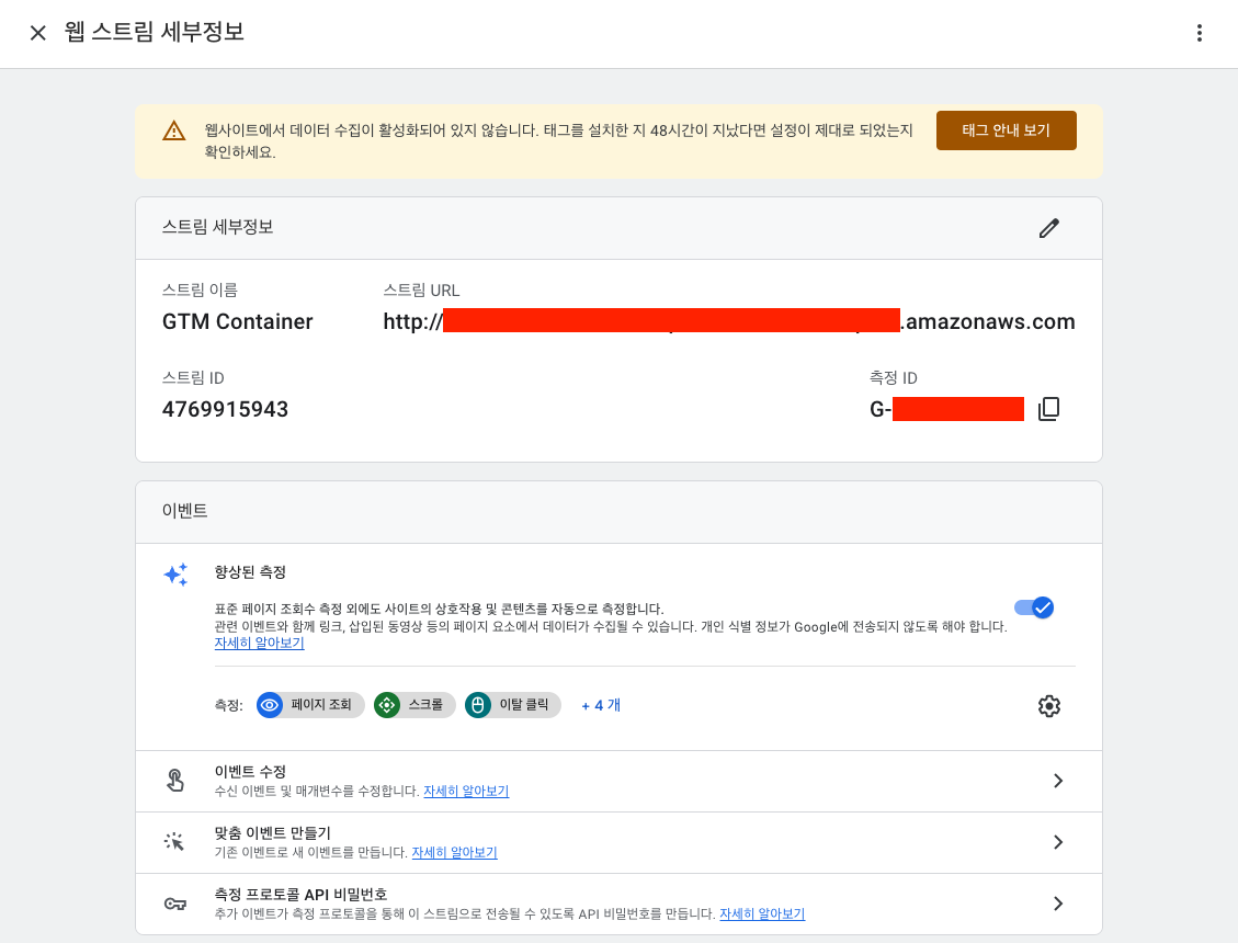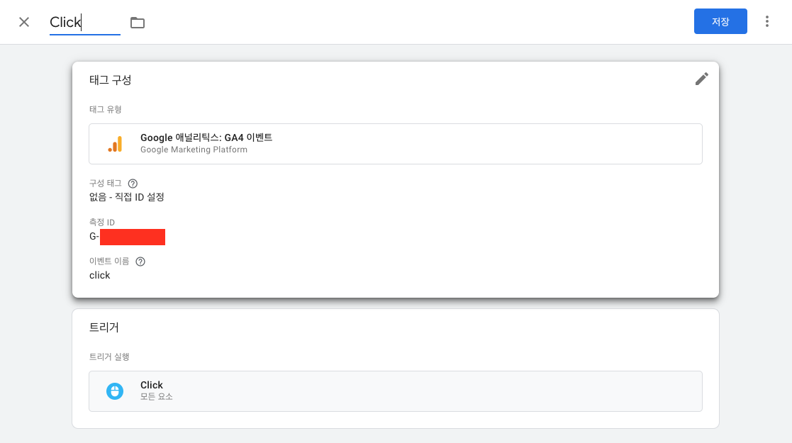 Click으로 지정합니다. - 측정 ID는 구글 애널리틱스 생성 시 발급받은