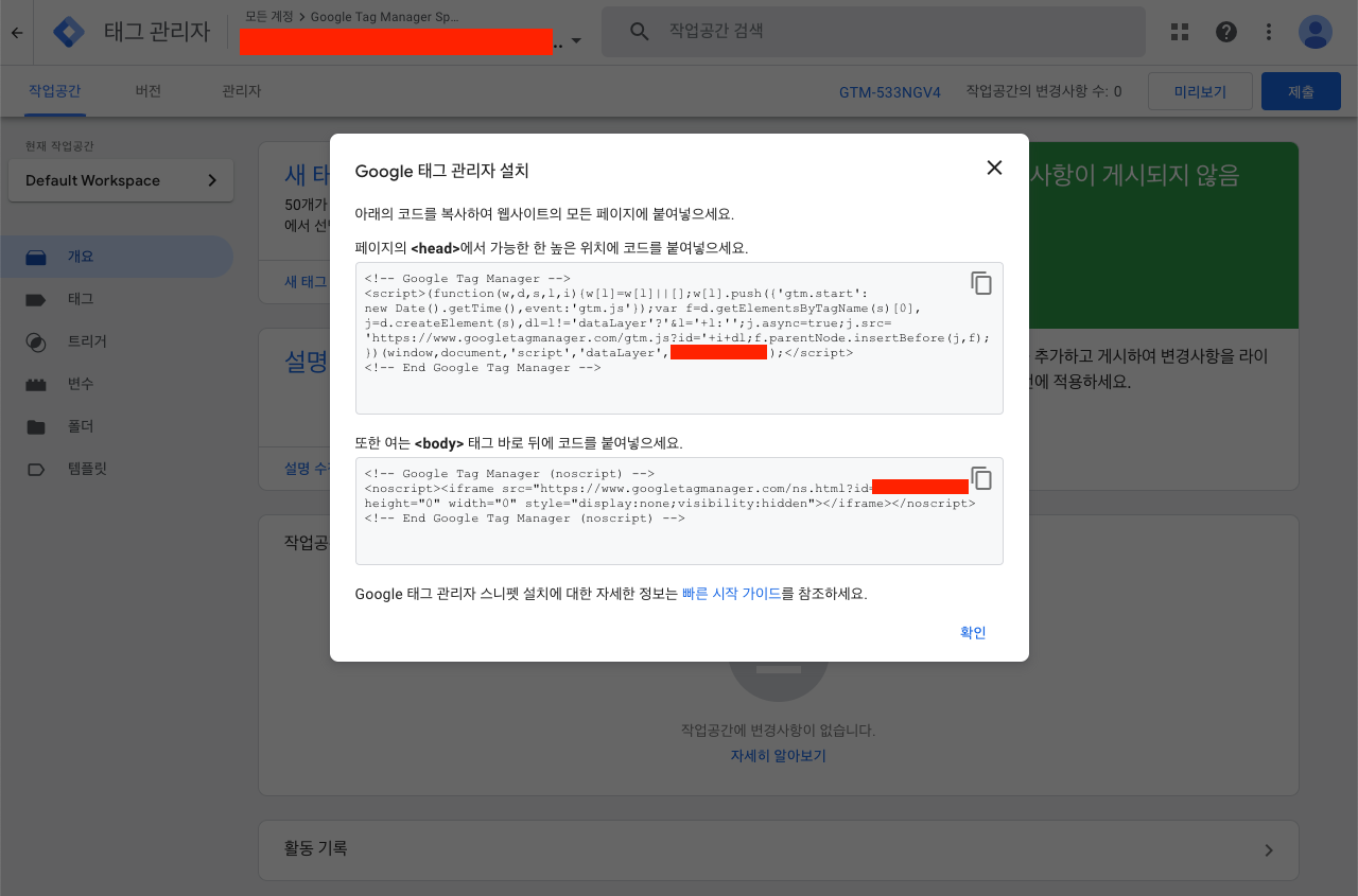 - 계정을 만들면 태그 관리자를 설치할 수 있는 스크립트를 받습니다.