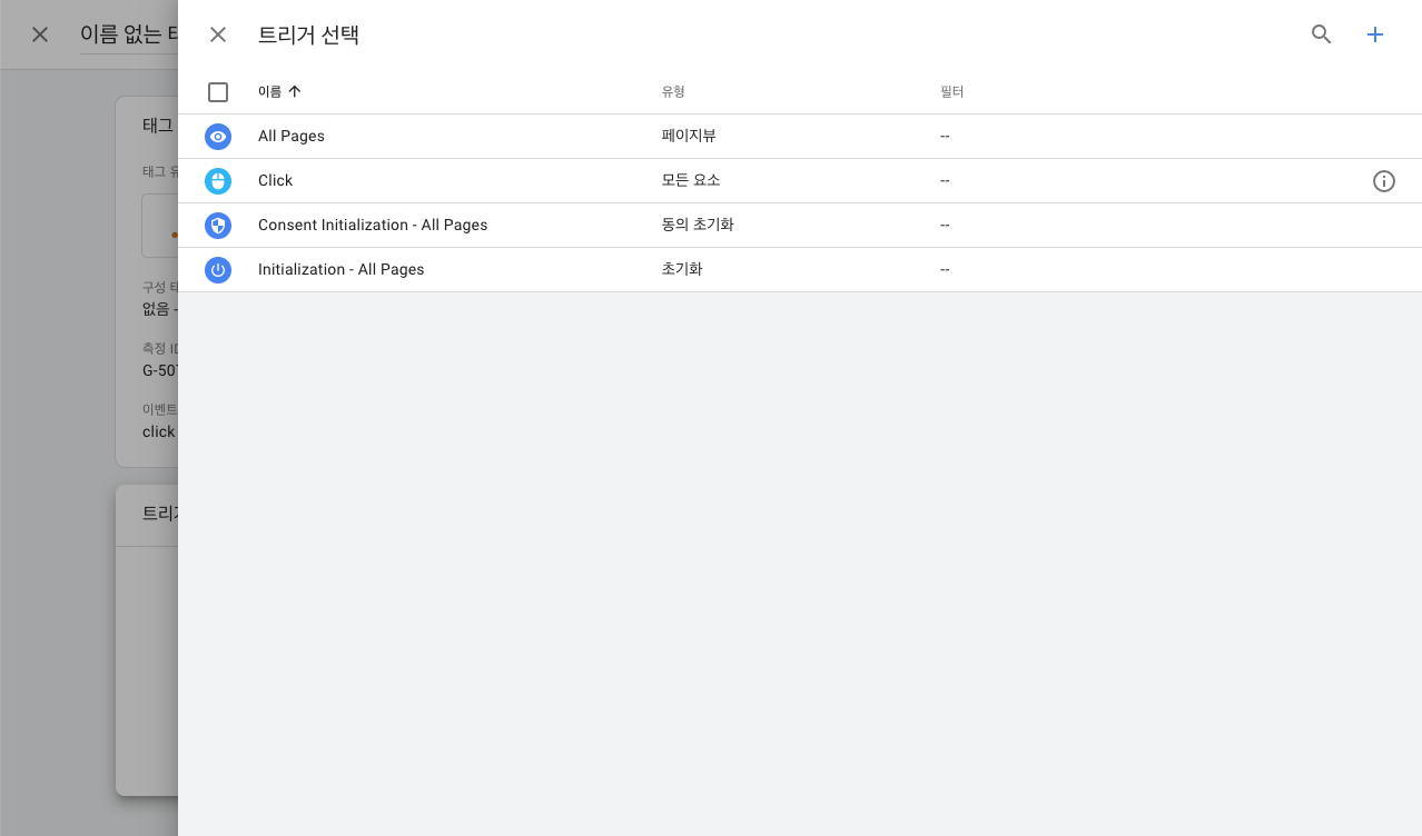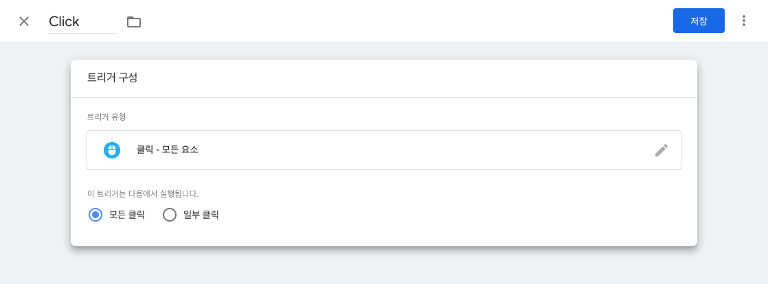 click으로 지정합니다.- 지정한 이벤트 이름으로 구글 애널리틱스에서 확인 가능합니다.