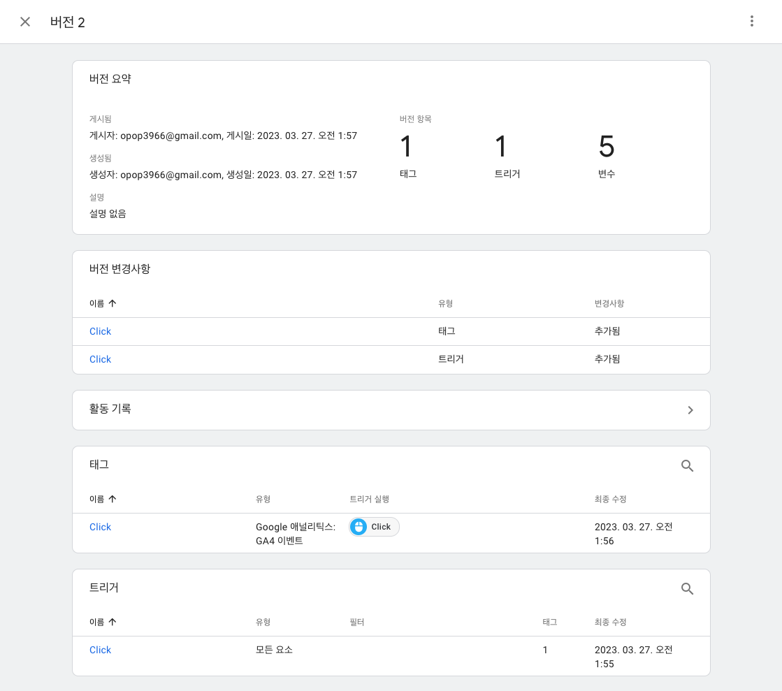 - 버전 변경사항엔 생성한 태그, 트리거 정보를 볼 수 있습니다.