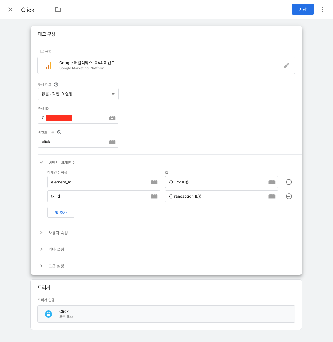 - 엘리먼트(element) 클릭 이벤트는 구글 태그 매니저(GTA, google tag manager)에 의해 자동으로 동작되기 때문에 UUID 삽입이 어렵다.