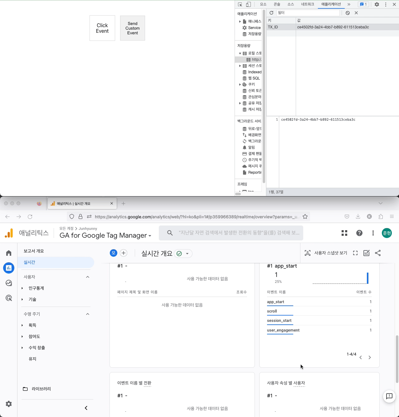 dataLayer객체에 추가합니다. - 애플리케이션 실행 커스텀 이벤트(custom event)를 발행합니다.