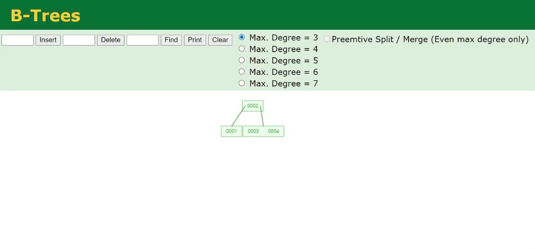 MySQL, Oracle, PostgreSQL 등 일부 데이터베이스들은 B+Tree를 인덱스 구조로 사용한다고 한다. 마지막으로 B-Tree를 생성, 삭제를 시뮬레이션해주는 사이트가 있다. 해당 사이트에서 B-Tree의 차수 별로 노드가 하나씩 추가될 때마다 어떤 변경이 일어나는지 살펴볼 수 있다.