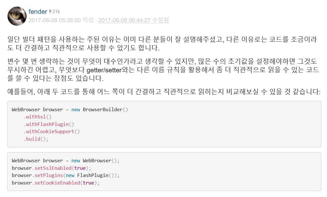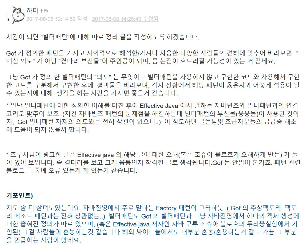 빌더 패턴과 관련한 대부분의 포스트들은 Effective Java의 빌더 패턴과 관련된 내용들이다. GoF 디자인 패턴에서 제시한 방식과 다소 차이가 있으므로 이를 구분지어 사용하는 것이 좋다. OKKY 커뮤니티에서 본 빌더 패턴 관련 글들이 참고할 만한 내용이라 포스트 마지막에 추가했다.