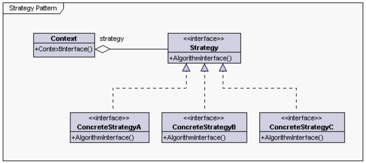 - 전략 인터페이스 구현체와 집합 관계이므로 객체를 외부로부터 전달받습니다.(집합 관계, aggregation)