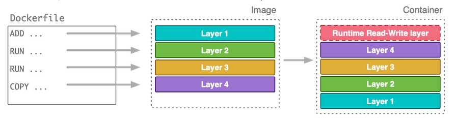 Dockerfile을 통해 도커 이미지를 만들면 도커 파일의 각 명령어(instruction)가 이미지를 구성하기 위한 레이어가 됩니다.