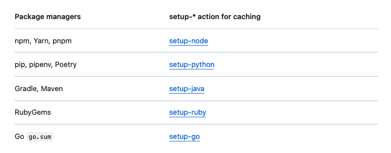 공식 문서를 살펴보면 setup-* 액션을 사용하면 직접 캐시 액션을 사용하지 않아도 캐시를 적용할 수 있는 방법이 소개되어 있다. 많은 캐시 액션 예제 글들이 직접 의존성 파일들을 캐싱하지만, setup-* 액션에 포함된 캐시 기능을 사용할 생각이다. 다음과 같은 setup-* 액션들을 지원한다.