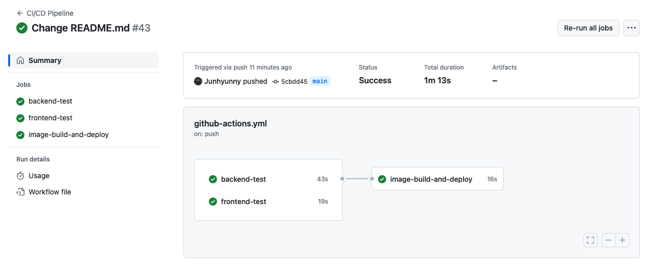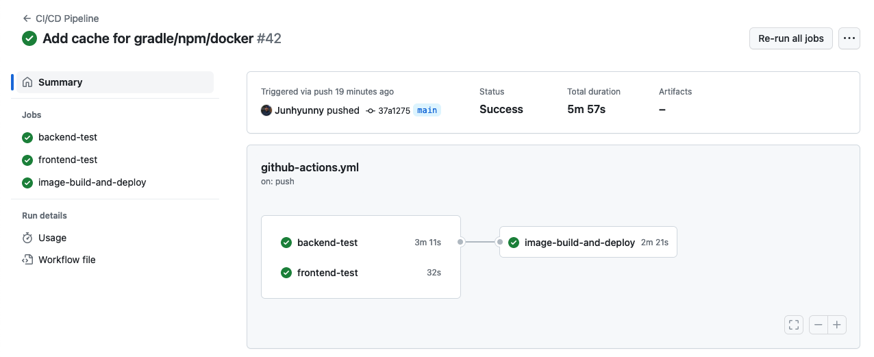 README.md 파일만 변경했기 때문에 효과가 극적으로 보이지만, 확실히 파이프라인 속도는 크게 개선되었다. 각 작업 로그를 보면 캐시가 정상적으로 동작했음을 확인할 수 있다.