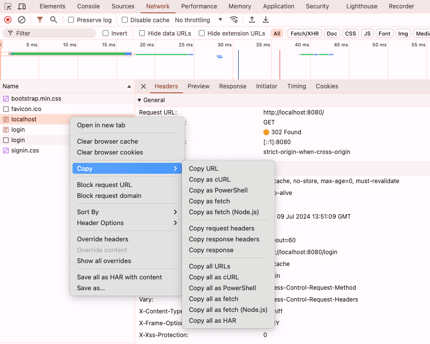 디버깅을 위해 HTTP 요청을 직접 만들기엔 너무 많은 데이터가 필요했다. 필자는 크롬의 HTTP 요청 재시도 옵션들 중 Copy as cURL을 선택했다. 이를 선택하면 실패한 요청과 동일한 cURL 명령어를 만들어준다. 복사된 cURL 명령어의 몇 가지 정보를 추가(혹은 변경) 후 사용한다.