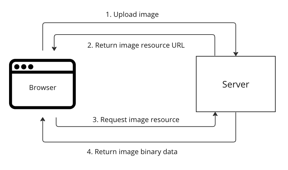 이번 포스트는 브라우저에서 이미지를 다운로드 받는 방법에 대해서만 집중적으로 다룹니다. 이미지를 업로드하는 기능이나 데이터베이스에 저장하는 방법은 이전 글들을 참고하시길 바랍니다. 이미지 반환 작업은 두 단계로 거쳐 이뤄집니다. 서버가 이미지 바이너리(binary)를 클라이언트로 그대로 내려주고 JavaScript로 이를 처리하는 방법도 있지만, 코드 복잡성을 줄이고 캐시 컨트롤(cache control) 적용을 위해 리소스 URL을 전달하는 방식을 사용했습니다.