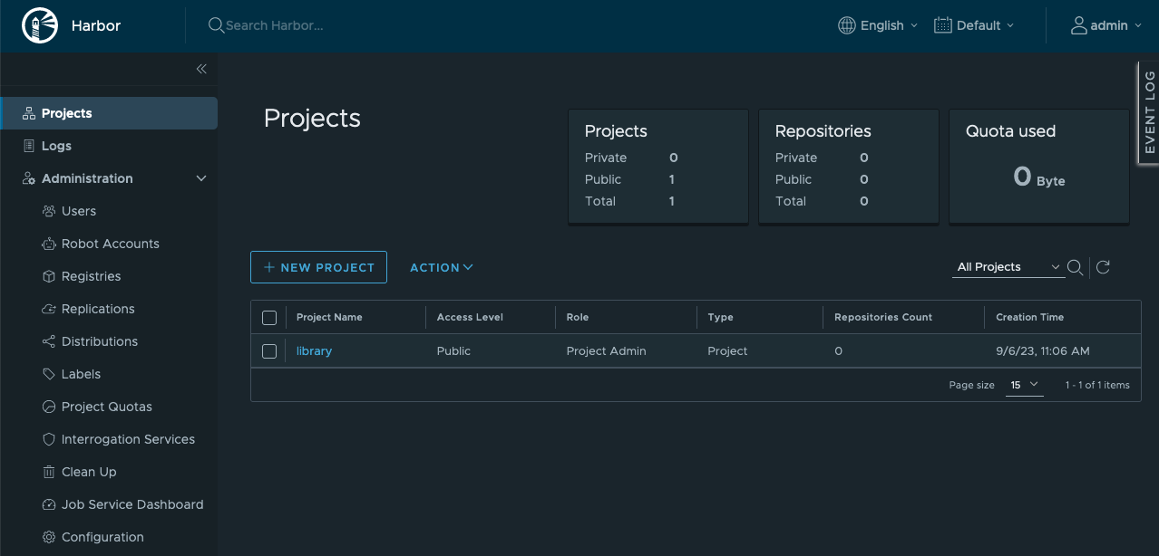 브라우저를 통해 하버 웹 페이지로 접속합니다. 변경하지 않았다면 초기 사용자 이름과 비밀번호는 다음과 같습니다.