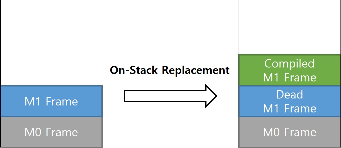 컴파일이 완료된 코드로 변경하는 작업을 의미합니다. 대상 코드가 컴파일이 완료된 상태가 되었음에도 최적화되지 않은 코드가 수행되고 있는 것이 발견되는 경우 이를 수행합니다. 인터프리터에 의해 수행되는 중에 오랫동안 루프가 지속되는 경우 사용됩니다. 루프가 끝나지 않고 지속적으로 수행되고 있는 경우에 큰 도움을 줄 수 있습니다.