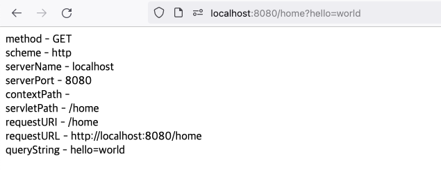 애플리케이션을 war 파일로 패키징(packaging)하여 톰캣 서버에 배포한다. 애플리케이션을 배포하는 방법은 Deploy war package when using spring boot framework 포스트를 참고하길 바란다. 테스트를 위해 컨트롤러 코드를 변경한다. HttpServletRequest 객체에 어떤 정보가 들어있는지 브라우저를 통해 확인하기 위해 다음과 같은 응답을 만든다.
