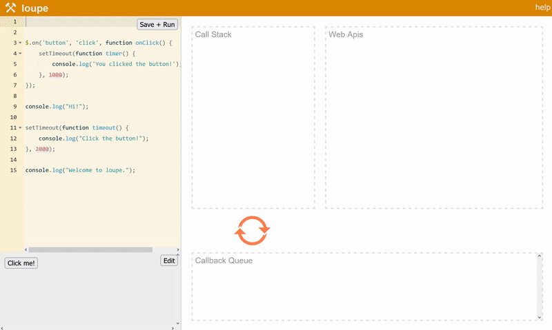 http://latentflip.com/loupe 사이트에서 직접 작성한 JavaScript 코드가 JavaScript 런타임에서 동작하는 모습을 확인할 수 있습니다.