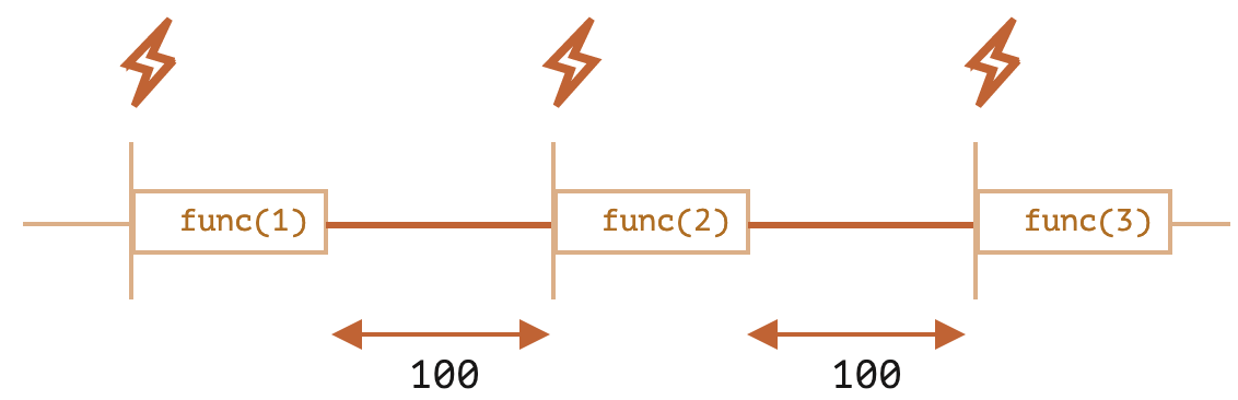 setInterval 함수는 콜백 함수의 실행 시간이 길면 콜백 함수 실행 간격이 짧아진다. 콜백 함수가 시작한 시점을 기준으로 시간을 잰다. 예를 들어 지정한 시간 간격이 100ms라고 가정해보자.