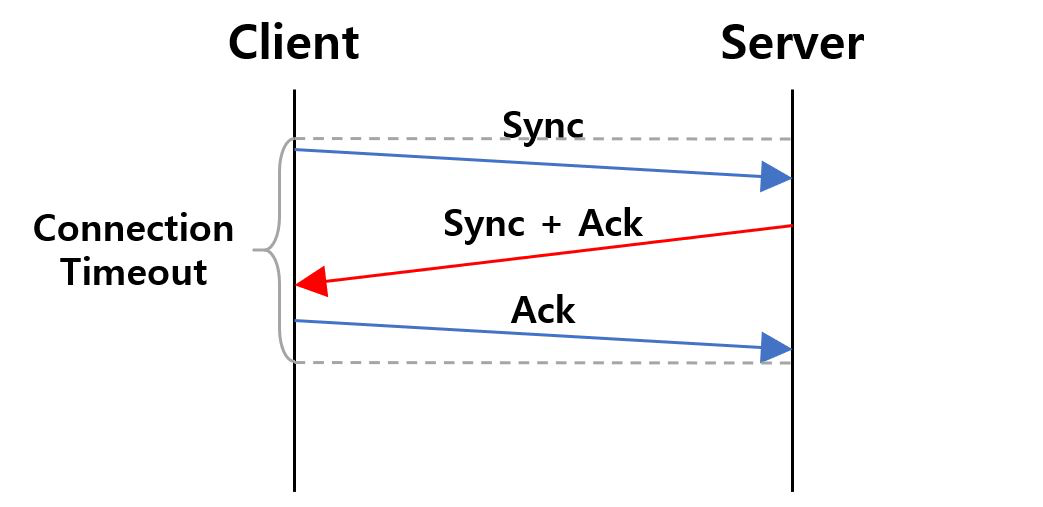 연결 타임아웃(connection timeout)은 클라이언트가 서버와 연결을 맺지 못하는 경우 발생한다. 클라이언트가 서버와 연결하는데 소요되는 시간의 임계치다. TCP 소켓 통신에서 클라이언트와 서버가 연결되는 과정을 3-Way 핸드쉐이크(handshake)라고 한다. 핸드세이크가 정상적으로 완료되어야 연결이 되었다고 말할 수 있다. 연결 타임아웃은 3-Way 핸드세이크가 정상적으로 수행되기까지 소요되는 시간이다.
