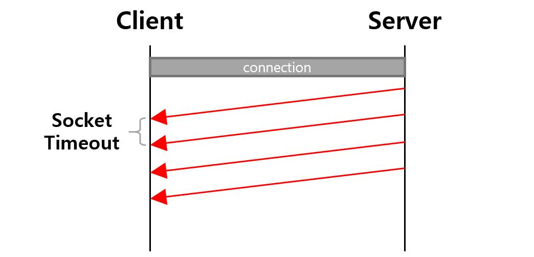 클라이언트와 서버가 정상적으로 연결된 이후에 발생한다. 서버는 클라이언트에게 응답 메시지를 전달할 때 하나의 메시지를 여러 개의 패킷(packet)으로 나누어 전달한다. 각 패킷 사이의 시간 차이가 있다. 이 패킷 사이의 시간 차이를 소켓 타임아웃(socket timeout)이라고 한다.