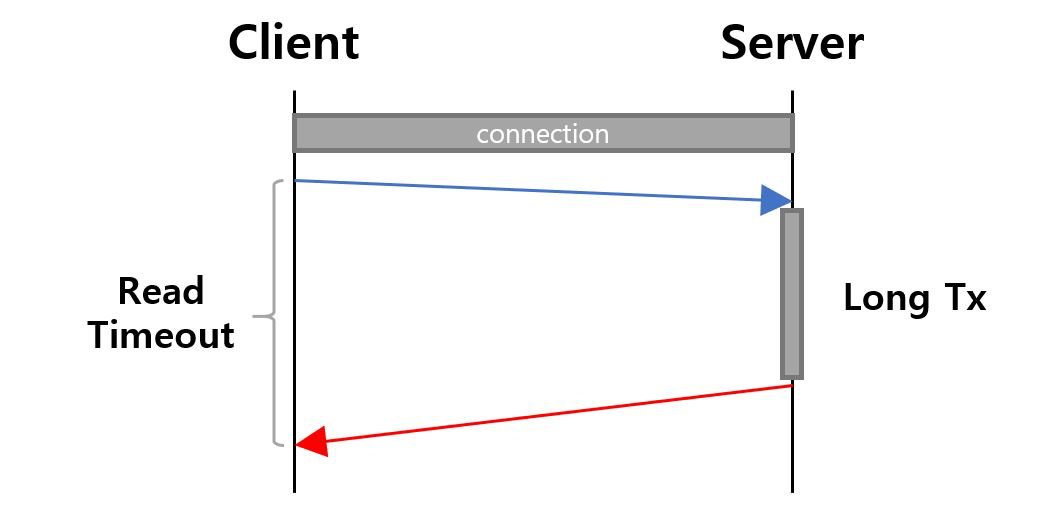읽기 타임아웃(read timeout)도 소켓 타임아웃과 마찬가지로 서버와 정상적인 연결 이후에 발생한다. 서버에서 I/O 작업이 길어지거나 락이 걸리는 등의 요청 처리 시간이 길어지면 클라이언트 측에서 발생한다. 클라이언트가 특정 시간 동안 서버로부터 요청에 대한 응답을 받지 못하는 경우이다. java.net 패키지의 모듈들은 소켓 타임아웃과 읽기 타임아웃을 혼용하여 사용한다.