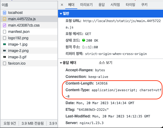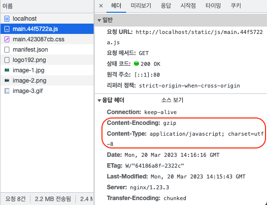 gzip으로 표시된다. 원래 컨텐츠 사이즈는 144kB, 압축 후 사이즈는 46.9kB로 표시된다. - 컨텐츠 타입은