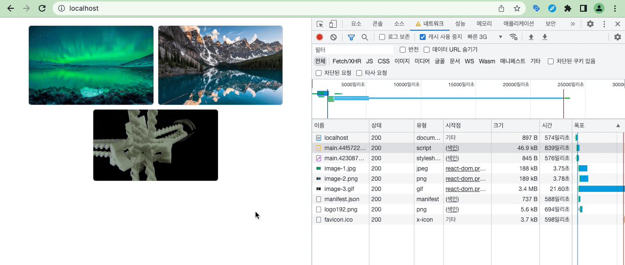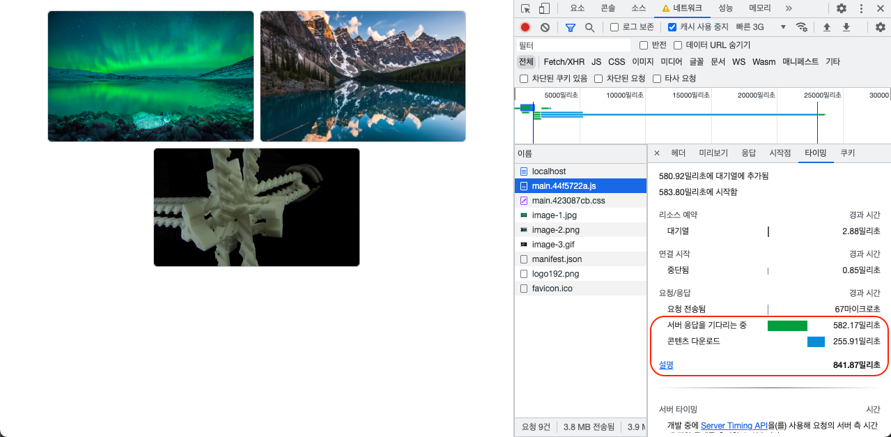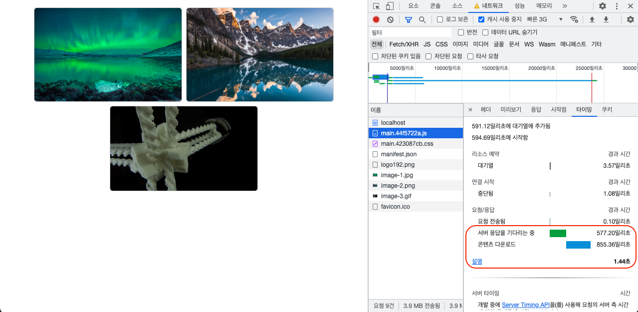 아래 예시를 보면 압축 적용 전후 고용량 이미지들을 다운로드 받는데 걸리는 시간 차이가 얼마 없음을 확인할 수 있다. 압축이 적용되지 않았을 때 다운로드 받은 각 리소스의 크기와 소요된 시간을 살펴보면 다음과 같다.
