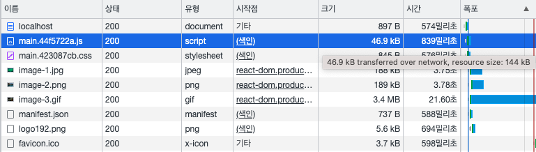 압축이 적용되었을 때 다운로드 받은 각 리소스의 크기와 소요된 시간을 살펴본다.