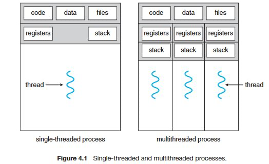 스레드는 프로세스 내에서 동작되는 여러 개의 실행 흐름이다. 프로세스 내의 주소 공간이나 자원들을 프로세스 내 스레드들끼리 공유하여 사용한다.(전역 변수 등) 메모리를 공유하기 때문에 동기화, 교착 상태(dead lock) 등의 문제가 발생할 수 있다. 각 스레드는 독자적인 스택(stack) 메모리를 가진다.