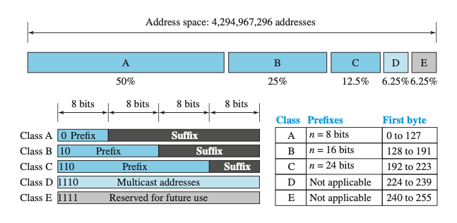 규칙은 단순하다. 접두사 비트를 통해 네트워크를 표현하고, 접미사 비트를 통해 각 네트워크별로 가질 수 있는 호스트 주소를 표현한다. 어떤 의미인지 정확히 감이 안 올 수 있지만, 각 클래스의 특징을 하나씩 살펴보면 어떤 컨셉인지 이해할 수 있다. 각 클래스별 특징들을 살펴보자.