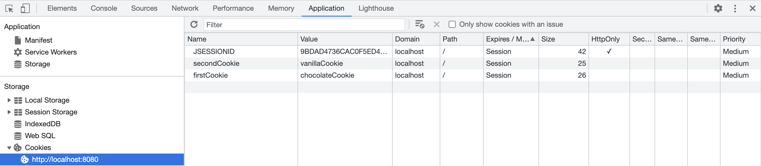 Cookie: firstCookie=chocolateCookie; secondCookie=vanillaCookie; JSESSIONID=9BDAD4736CAC0F5ED4078C2AC072AFCB