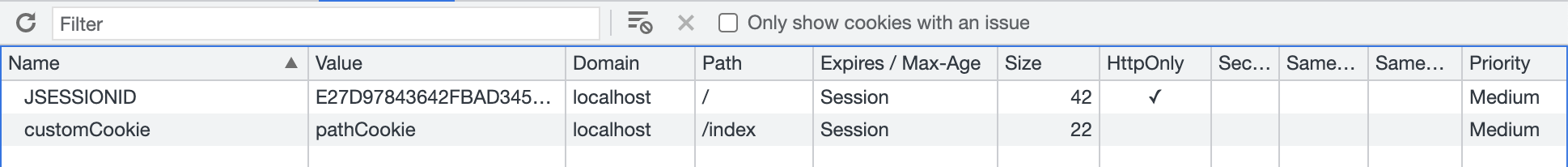 customCookie는 HttpOnly 속성을 지정한다.otherCookie는 별도 설정 없이 생성한다.