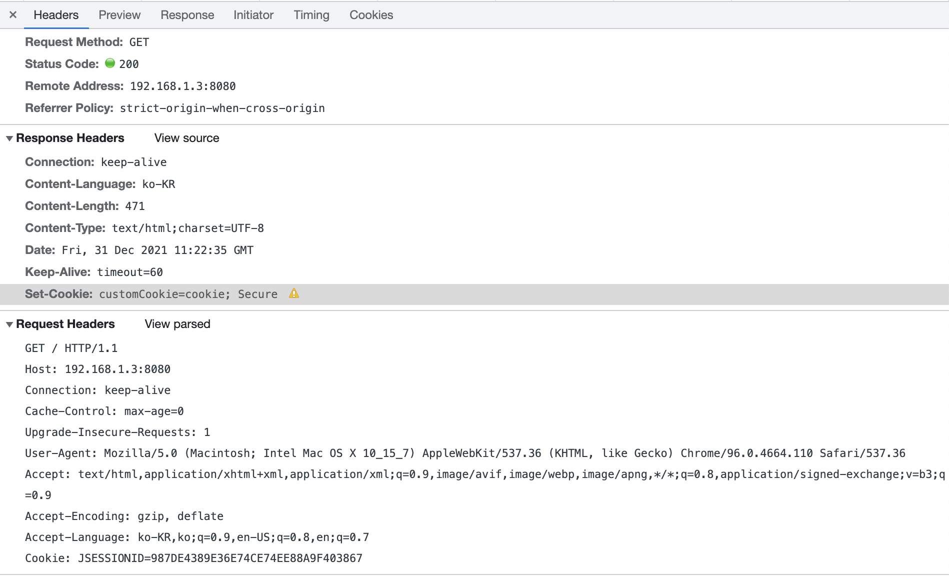 크롬 브라우저 개발자 도구 네트워크 탭(tab)에서 응답 정보를 보면 쿠키 정보가 담긴 것을 확인할 수 있다.