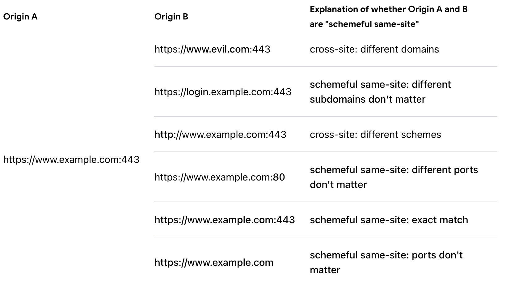 아래 표는 스킴풀(schemeful) 동일 사이트와 크로스 사이트를 구분한 예시이다.