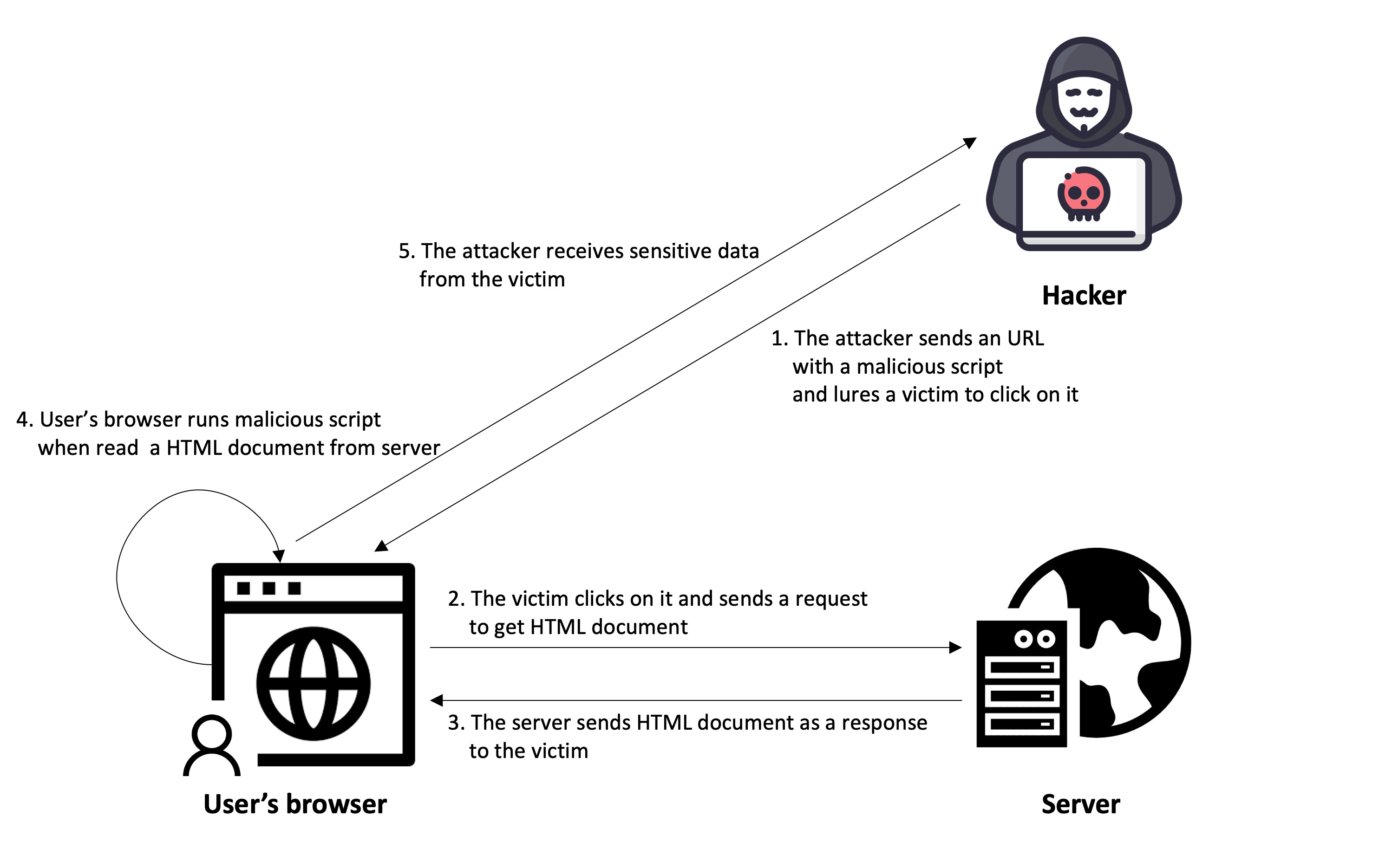 - 사용자의 브라우저가 응답 받은 HTML 문서를 읽으면서 필요한 스크립트를 실행하는 중에 악성 스크립트가 동작합니다.