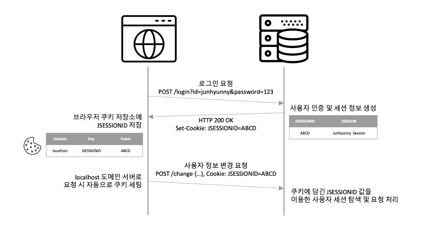 - 브라우저 쿠키에는 세션 정보를 조회할 수 있는 세션 키가 저장된다.
