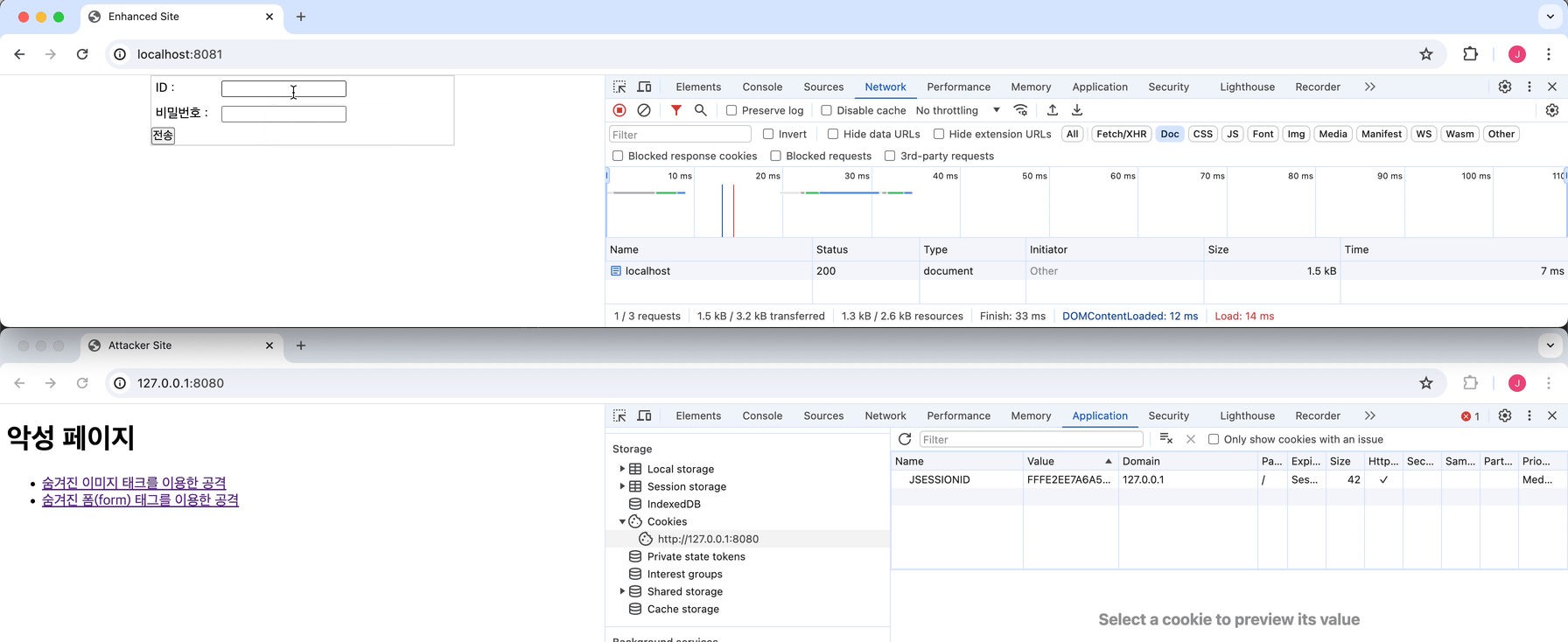 - 악성 페이지에는 서버를 공격하기 위한 HTTP 요청 스크립트가 있다.