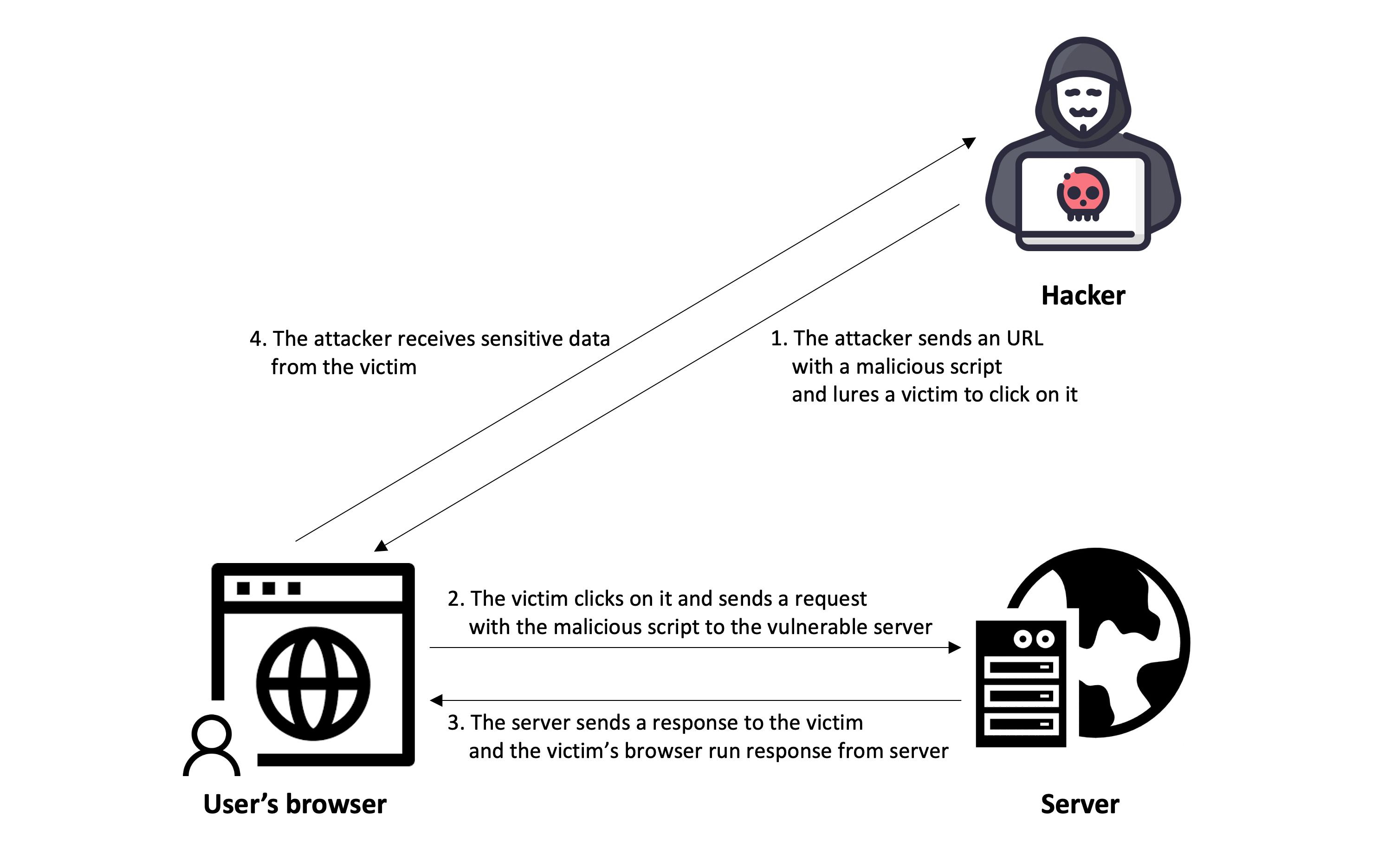 - 일반 사용자의 브라우저에서 응답 메시지를 실행하면서 악성 스크립트가 실행됩니다.