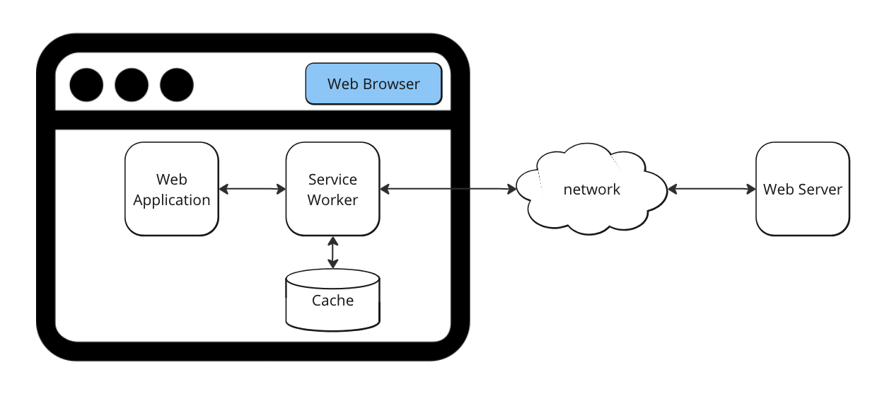 서비스 워커는 웹 브라우저에서 실행되는 백그라운드 스크립트다. 웹 애플리케이션의 성능을 향상시키고 기능 구현에 도움을 주는 기술이다. 웹 페이지와 별개로 동작하며 일종의 네트워크 프록시(proxy)로서 프론트엔드 애플리케이션과 서버 사이에서 요청과 응답을 처리할 수 있다. 네트워크 연결이 불안정한 경우에도 사용자 경험을 향상시킬 수 있다. 로컬호스트(localhost)를 제외하면 HTTPS 통신이 가능한 서버에서만 동작한다. 대표적으로 다음과 같은 기능을 제공한다.