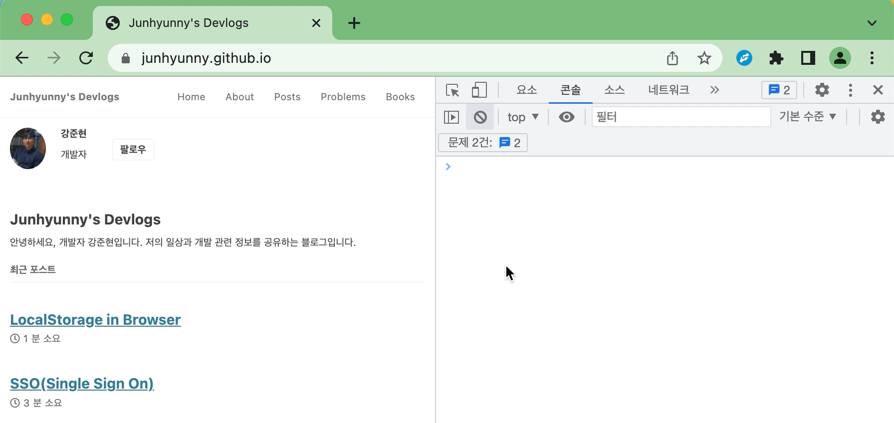 https://junhyunny.github.io/사이트로 재접속하여 저장된 데이터를 확인합니다.