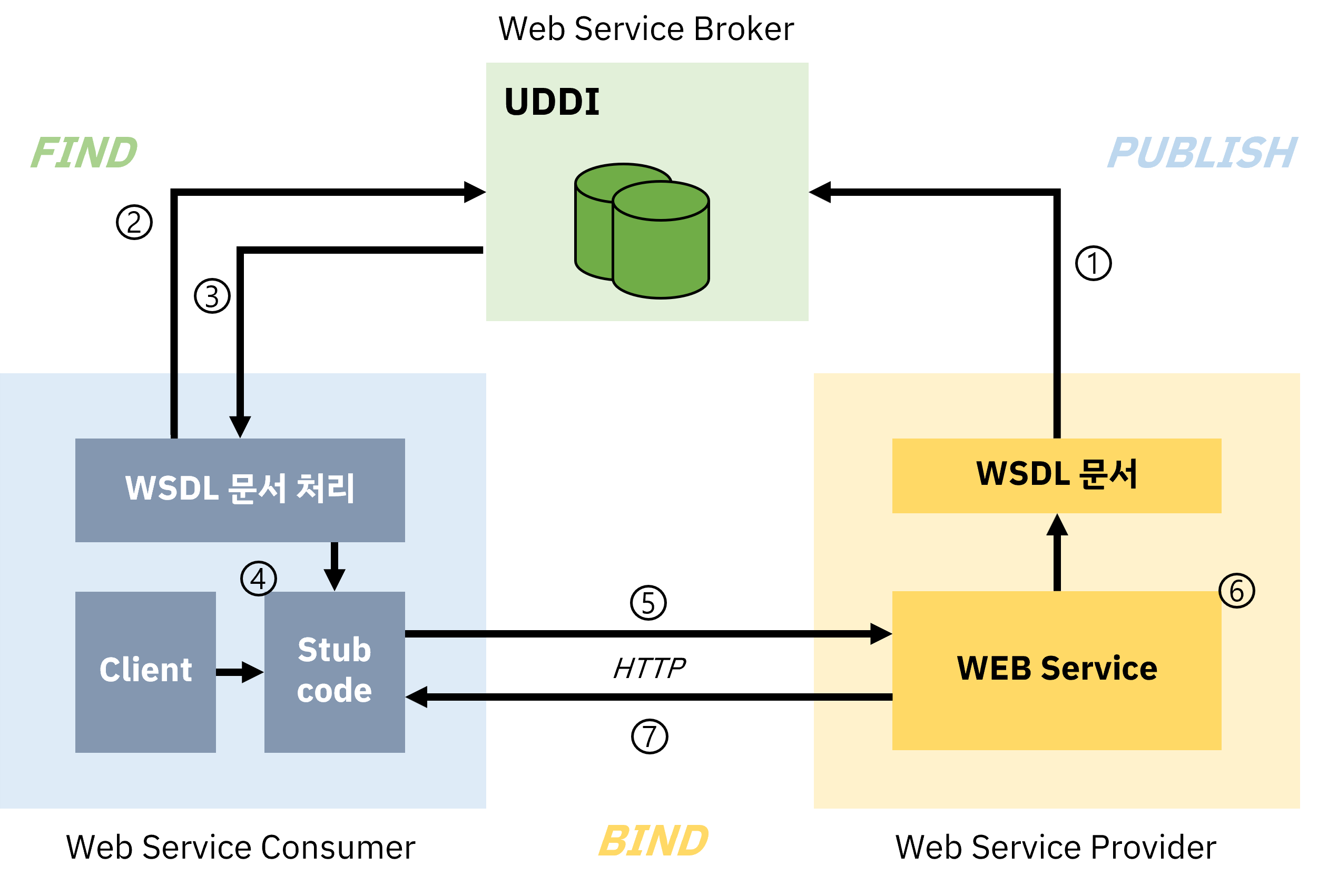 - 웹 서비스 제공자(provider)는 자신이 제공하는 API를 WSDL 문서로 만들어 UDDI 서버에 배포합니다.
