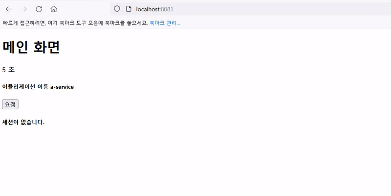 JSESSIONID를 이용하여 요청하므로 서버에서 관리하는 세션(Session) 정보는 변경되지 않습니다. - 세션에 저장한 데이터를 페이지 표시하여, 두 인스턴스의 세션 데이터가 공유되는지 확인합니다.