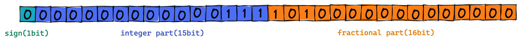 - 부호(1비트), 정수부(15비트)와 소수부(16비트)로 나눈다.