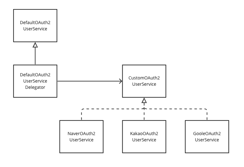 스프링 시큐리티는 OAuth2 프로토콜 표준을 따르기 때문에 인증, 인가, 리소스 획득 작업은 어떤 플랫폼을 사용하든 동일한 과정을 거칩니다. 플랫폼마다 다른 점은 사용자 정보 스키마입니다. 각 플랫폼마다 다른 모습, 다른 프로퍼티 이름으로 사용자 정보를 반환하기 때문에 이 부분을 맞춰 개발할 필요가 있습니다. 필자는 DefaultOAuth2UserService 클래스를 확장하여 각 플랫폼 별로 획득한 인증된 사용자 정보를 신규 생성 혹은 조회하도록 설계하였습니다. CustomOAuth2UserService 인터페이스로 추상화하여 전략 패턴(strategy pattern)을 적용한 이유는 추후 연결할 플랫폼이 늘어날 것을 고려했기 때문입니다. DefaultOAuth2UserService 구현 코드를 설명할 때 이에 대한 추가적인 이야기를 하겠습니다.