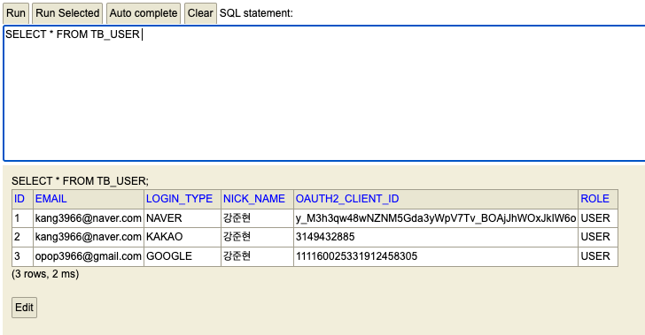H2 콘솔을 통해 데이터베이스를 확인하면 사용자 정보가 다음과 같이 저장됩니다.