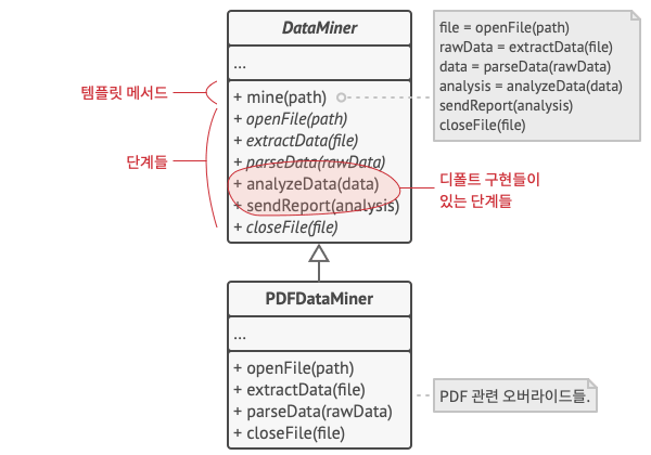 코드 재사용을 위한 디자인 패턴입니다. 부모 클래스의 메서드에 실행 흐름을 제어하는 코드를 정의합니다. 실행 흐름을 제어하는 코드는 비즈니스 로직의 골격 역할을 수행합니다. 부모 클래스는 공통 알고리즘을 일련의 단계들로 나누고 이를 메서드로 정의합니다. 각 단계들은 비즈니스에 따라 실제 구현 방법이 다를 수 있으므로 자식 클래스들은 이를 재정의합니다.