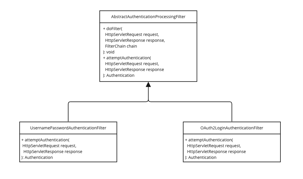 스프링 시큐리티(spring security) 프레임워크의 인증 프로세스에는 AbstractAuthenticationProcessingFilter 클래스가 존재합니다. 일련의 인증 과정을 부모 클래스에서 정의하고 있습니다.