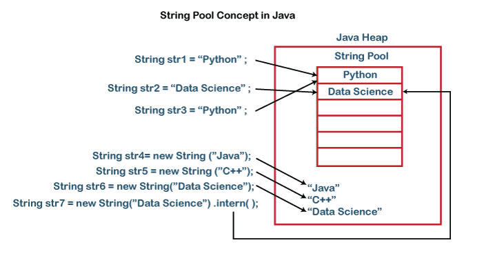 - 동일한 값을 가지는 문자열이 이미 풀에 있는 경우 풀에 저장된 문자열이 반환합니다.