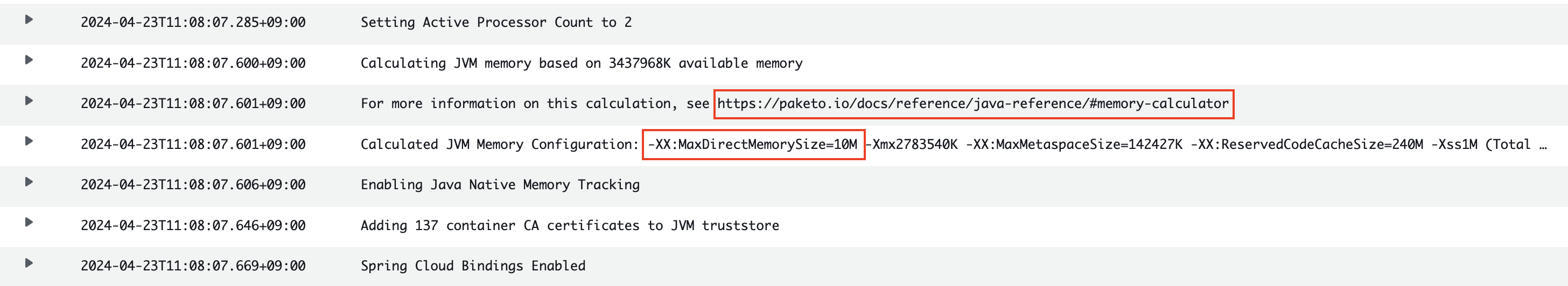 그렇다면 어디서 다이렉트 메모리 사이즈를 제한하는 것일까? 지금 프로젝트는 필자의 회사에서 메인테이닝(maintaining)하는 파케토 빌드팩(paketo buildpack)을 사용하고 있다. 위 로그를 보면 빌드팩에서 어떤 공식으로 메모리를 할당하는지 확인할 수 있는 링크를 제공하고 있다. 해당 링크를 들어가보면 파케토 빌드팩은 컨테이너 환경에서 실행되는 자바 애플리케이션의 최적화를 위해 메모리 제한하는 메모리 계산기(Java Memory Calculator)를 사용한다는 설명을 볼 수 있다.