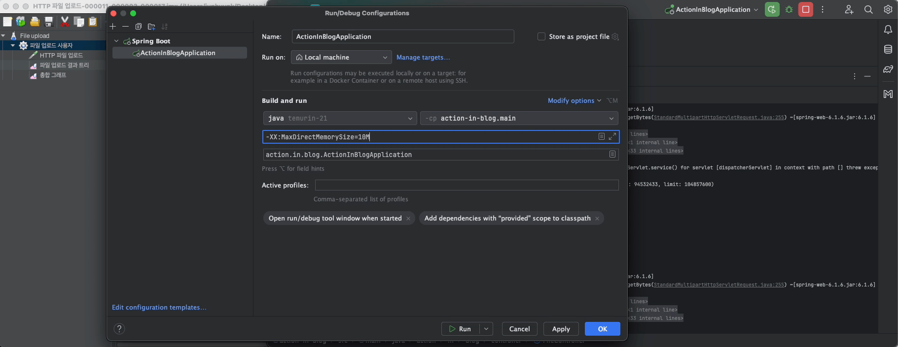 -XX:MaxDirectMemorySize=N옵션을 통해 다이렉트 메모리 사이즈가 10MB로 제한되어 있었다.